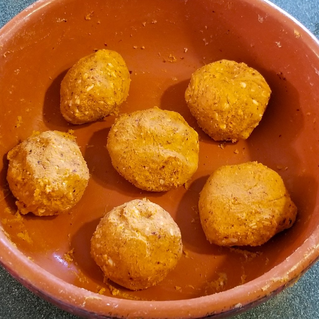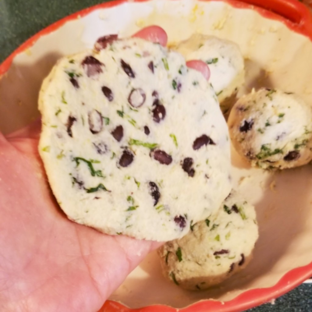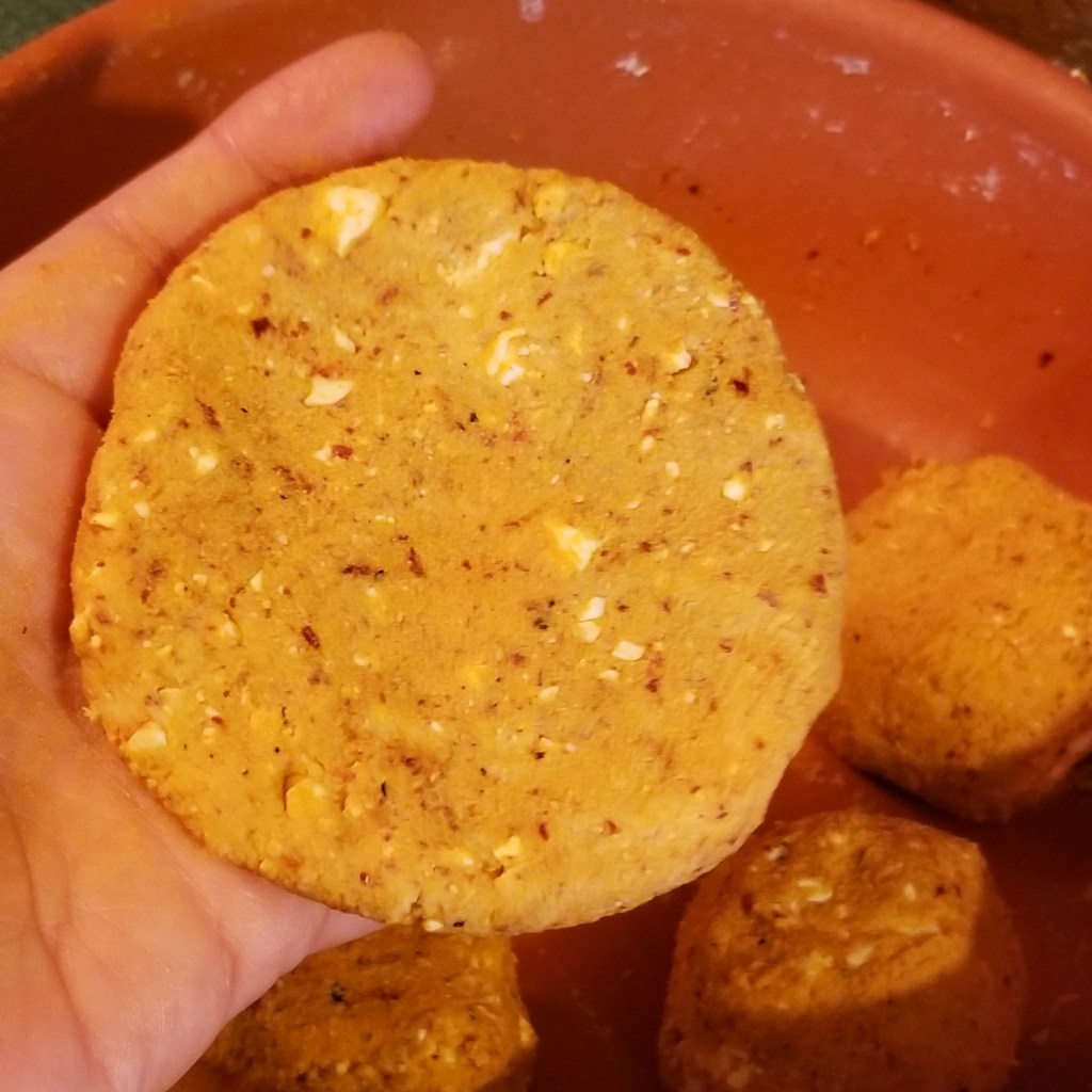 Working with one ball of dough at a time, pat back and forth between hands, to flatten into a disk: