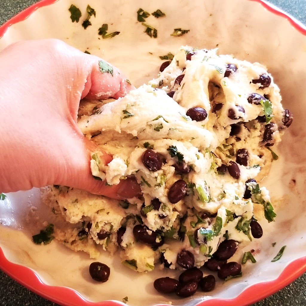 Bean filling: place beans and cilantro in another bowl with the other half of the dough (photo below, left). Incorporate with a spatula, then knead lightly, as with the other filling (photo below, right):