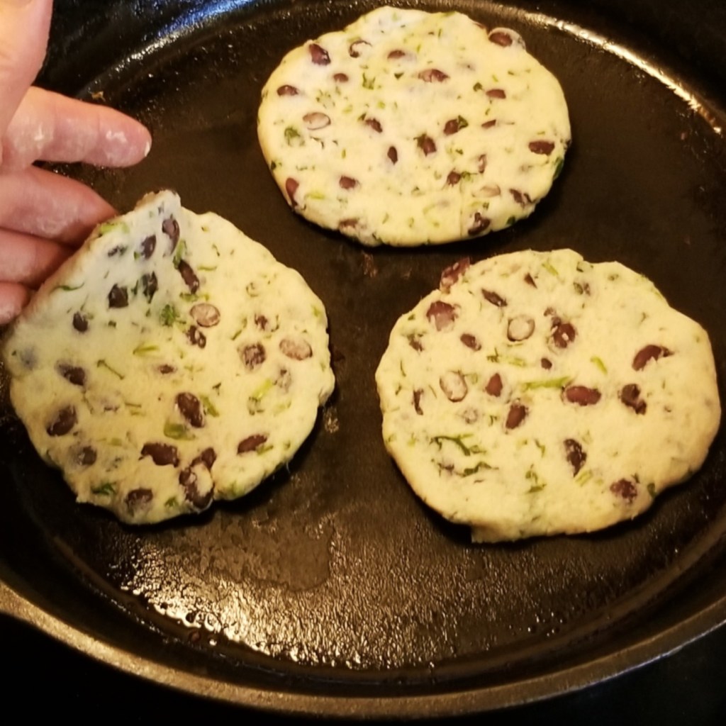 Gently drop patty on hot comal or skillet, then continue with more dough portions (photo below, left). Allow patties to cook until bottom is dry and starting to brown, then flip (photo below, right):