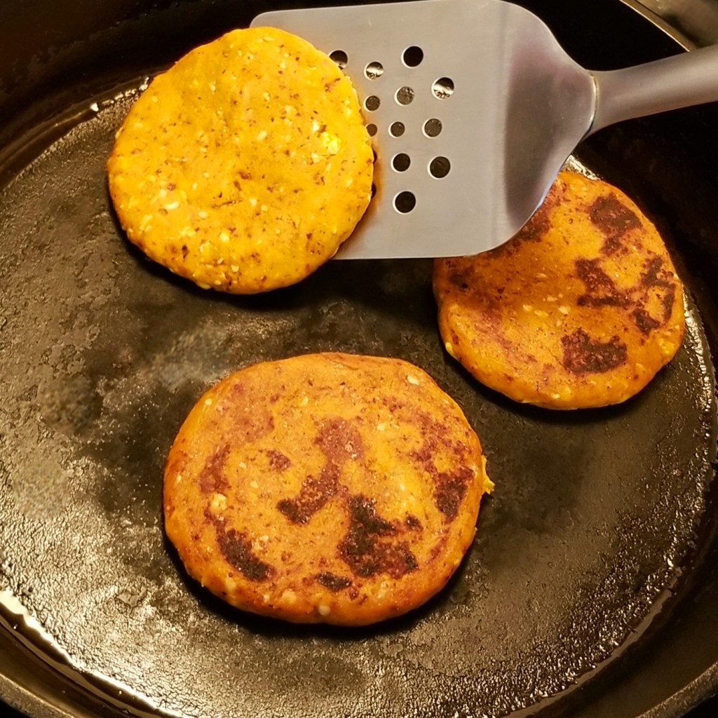 Continue for about ten minutes, flipping and rotating the patties until fully cooked. It is important to be patient and keep the heat low, so the patties do not burn, brown uniformly, and are fully cooked inside. Transfer to a plate and cover, to keep warm. Repeat with more patties until all are cooked.