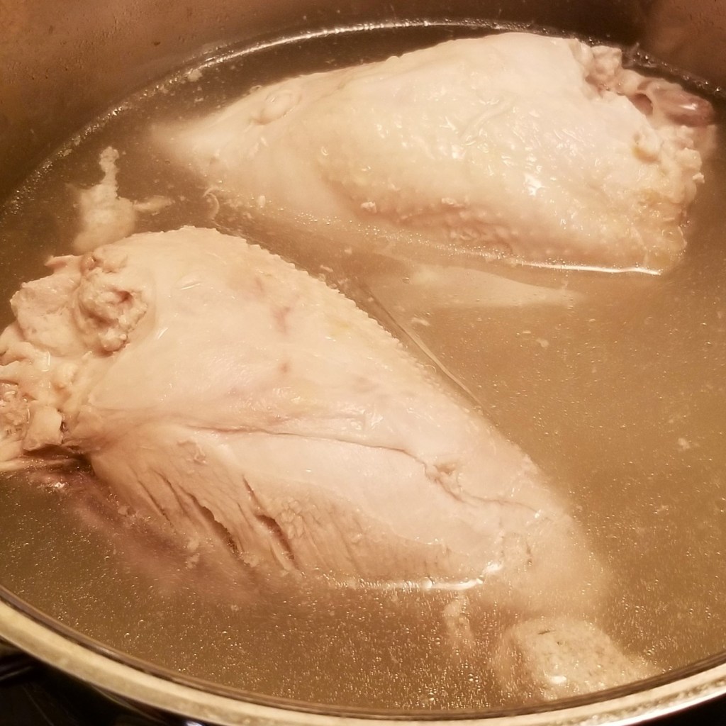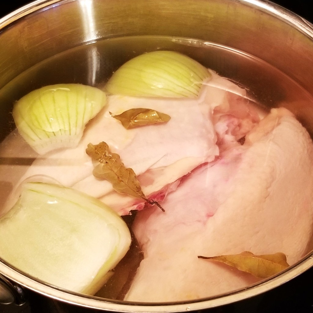Cook chicken: Place chicken pieces, bay leaves, and one piece of onion in a large pot. Fill with water, to cover chicken (photo below, left). Bring to boil over high heat, then reduce to medium, and cook, covered, for 20-30 minutes, until chicken is tender and fully cooked (photo below, right):