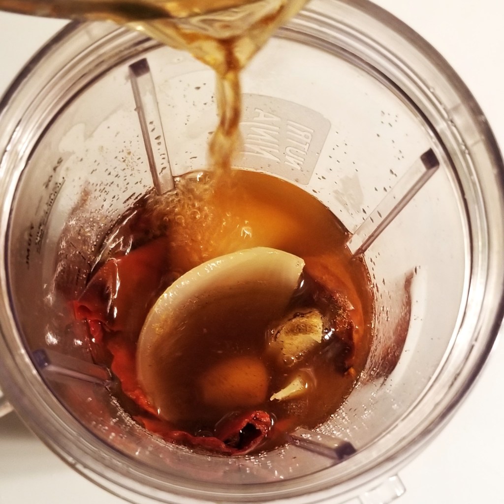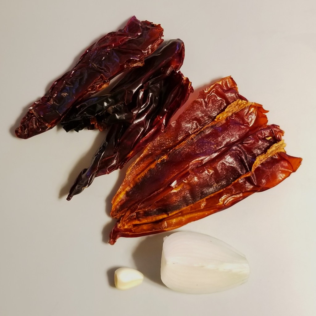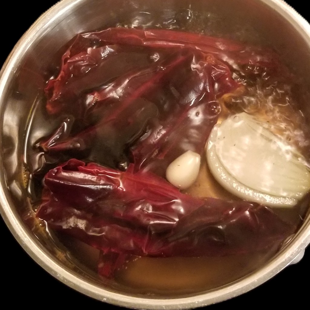 Prepare sauce: Boil two cups of water in a saucepan. Add cleaned guajillo peppers, garlic clove, and the other piece of onion: