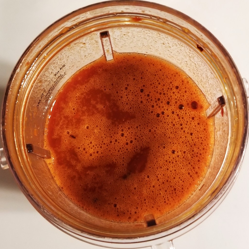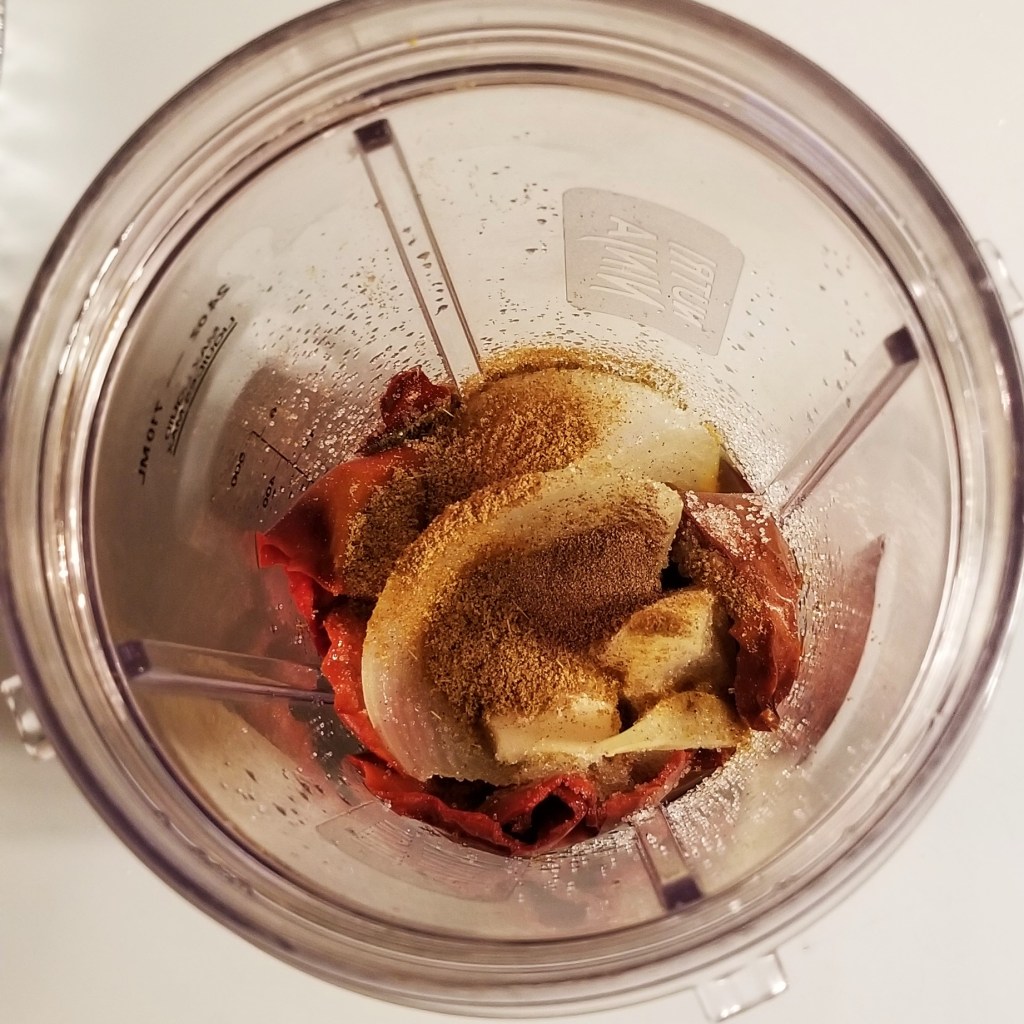 Transfer to a blender jar, add tomato paste, half a teaspoon of salt, cumin and all-spice (photo below, left); pour soaking water in (photo below, centre). Process until smooth (photo below, right):