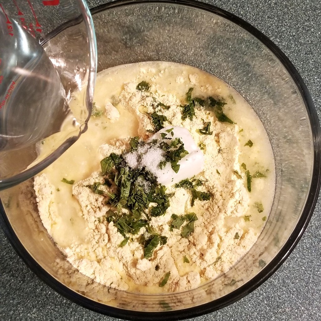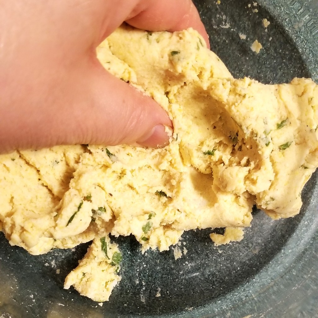 Prepare corn dumplings (chochoyones): Place nixtamalized corn flour, one teaspoon of salt, lard (or oil), and epazote in a bowl; add half a cup of water (photo below, left). Knead gently to incorporate, adding more water gradually (about 3/4 cup total), to form a soft dough (photo below, right):