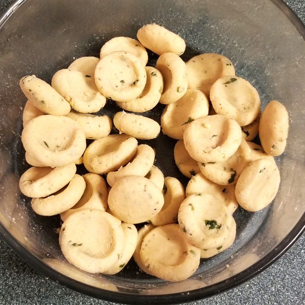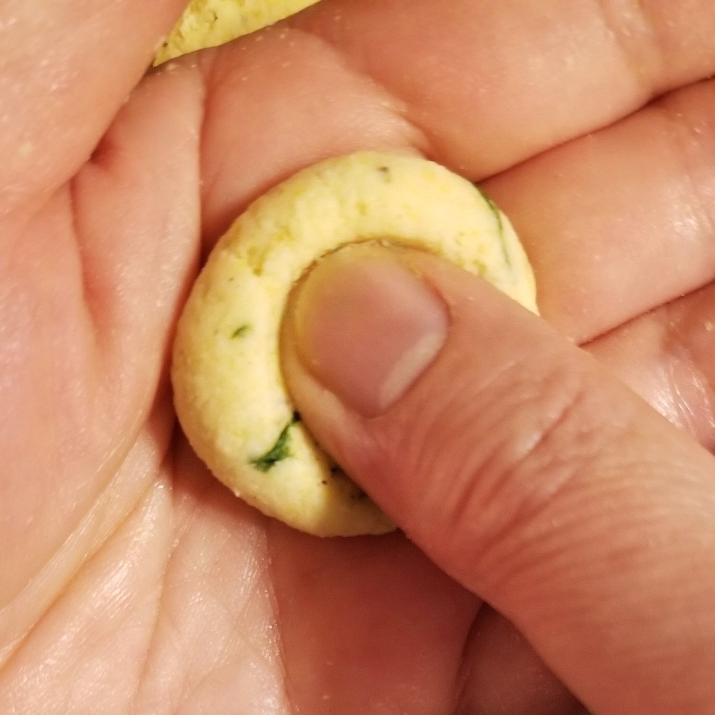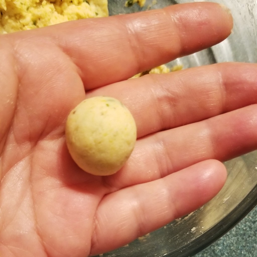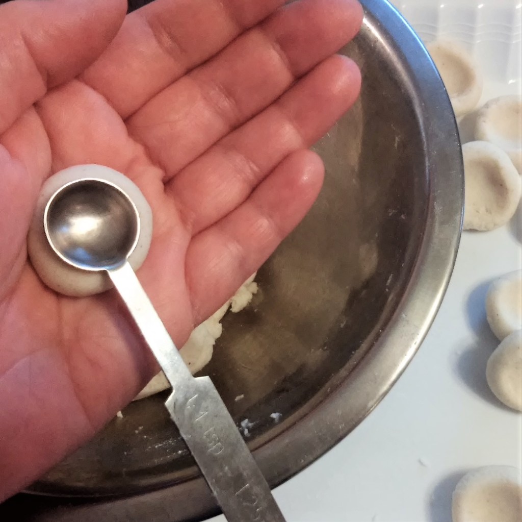 Take about one teaspoon of dough, and form into a ball (photo below, left). Press the centre of the ball, to flatten and form a well, using either a finger or thumb (photo below, centre), or the back of a small measuring spoon (photo below right):