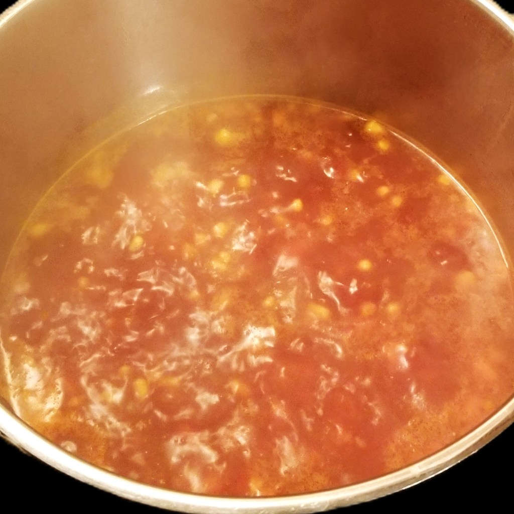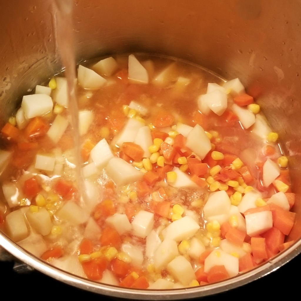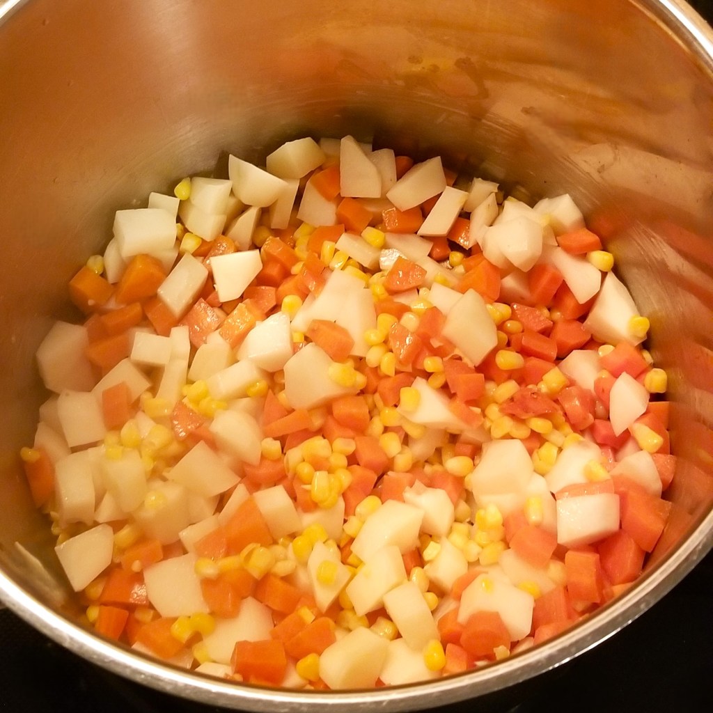 Finish soup: Warm up one tablespoon of oil in a large pot over medium heat; add corn kernels, and diced carrots and potatoes (photo below, left). Let the veggies cook for one minute, then stir; do not worry if some are sticking to the bottom, and continue cooking for another two minutes. Pour in reserved broth (photo below, right):