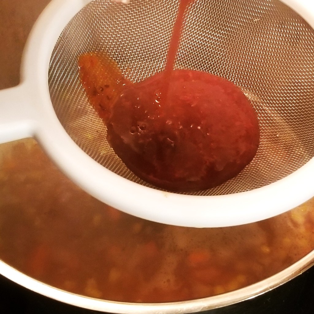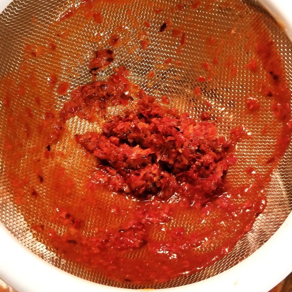 Scrape any browned bits from the bottom of the pot with the back of a wooden spoon, then add reserved sauce, straining through a mesh (photo below, left). Discard solids left behind in the mesh (photo below, right):