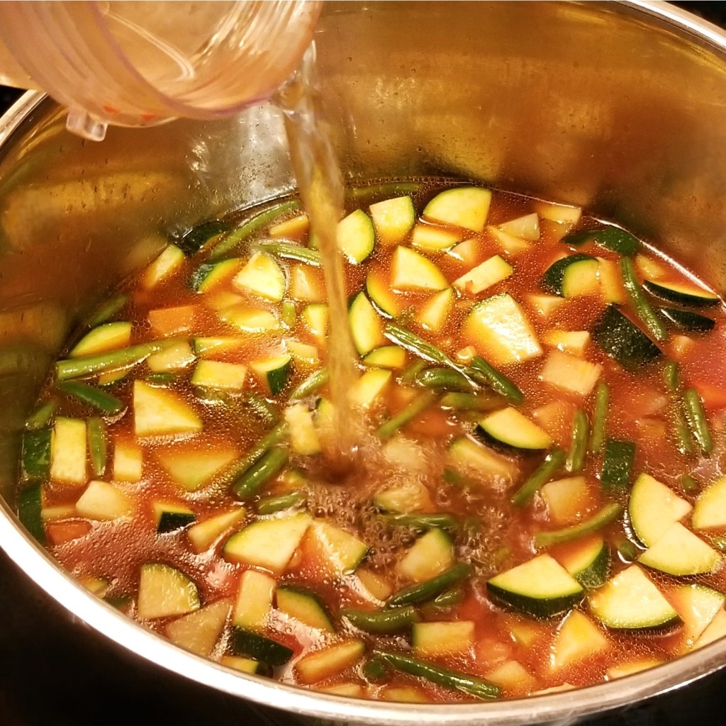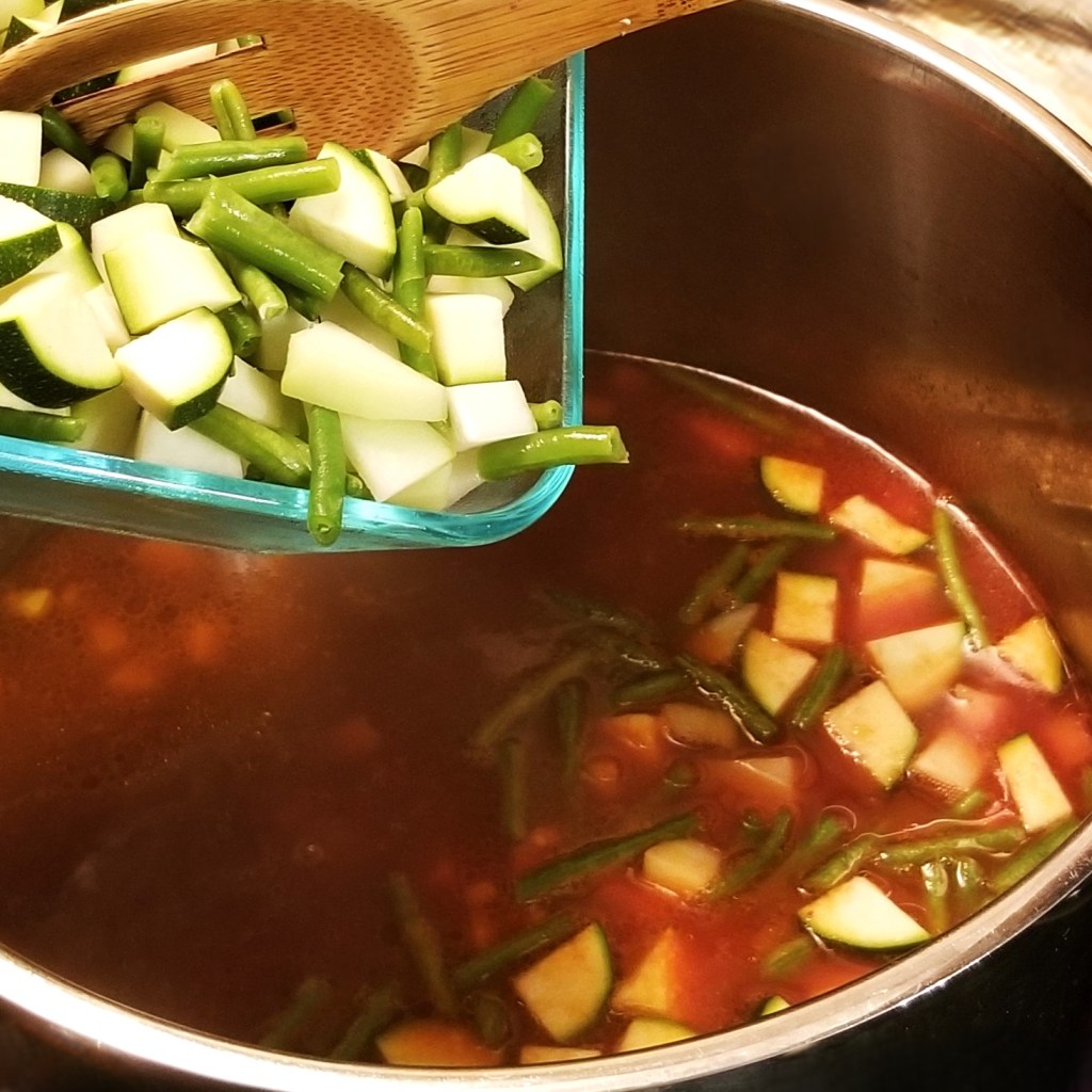 Stir and bring back to boil (photo below, left). Add the rest of the veggies (diced chayote, zucchini and sliced green beans, photo below, right):