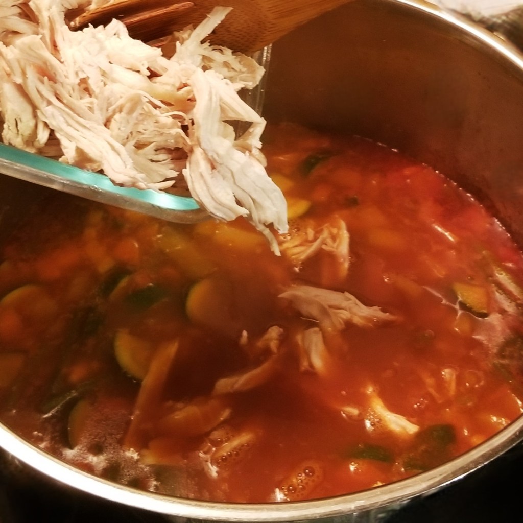 Add reserved chicken pieces (or shredded chicken meat, photo below left). Stir to incorporate, season with salt and pepper, to taste, then gently drop in reserved chochoyones (photo below, right):