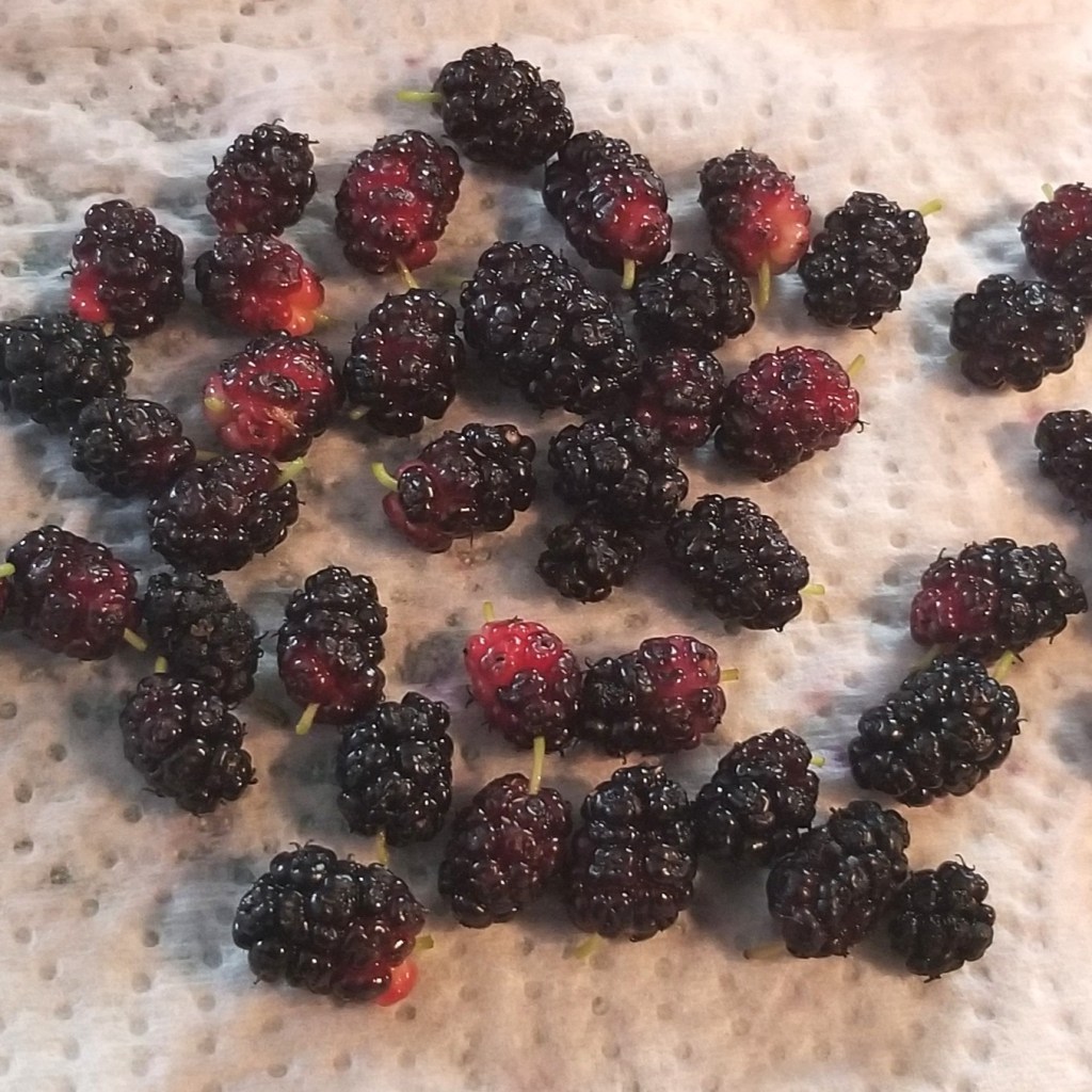 This mulberry just sprouted next to our garage many years ago, and because it is so close to the structure, we trim it twice or three times a year to keep it manageable as a bush (just like the song, lol, photo below, left). The fruit is harvested when it has completely or almost completely turned black, sweet and loaded with antioxidants (photo below, right):