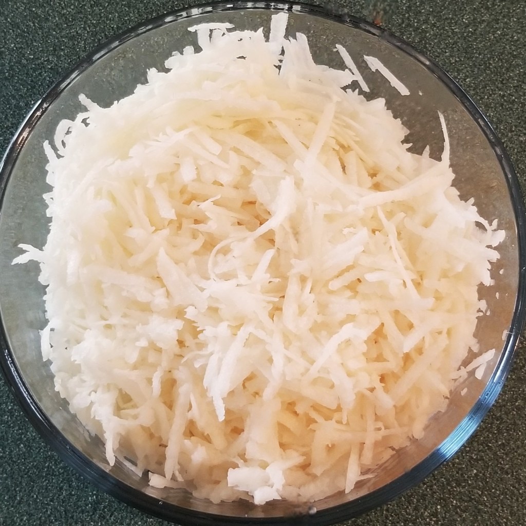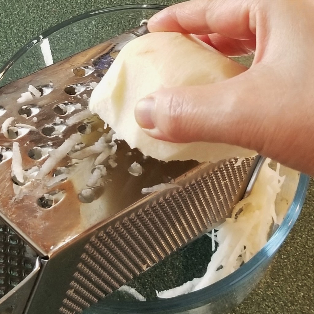 Slice in half, then work with one piece a time, shredding with the coarse side of a box grater (photo below, left). Continue with the other piece, to obtain about two cups of shredded jícama (photo below, right):