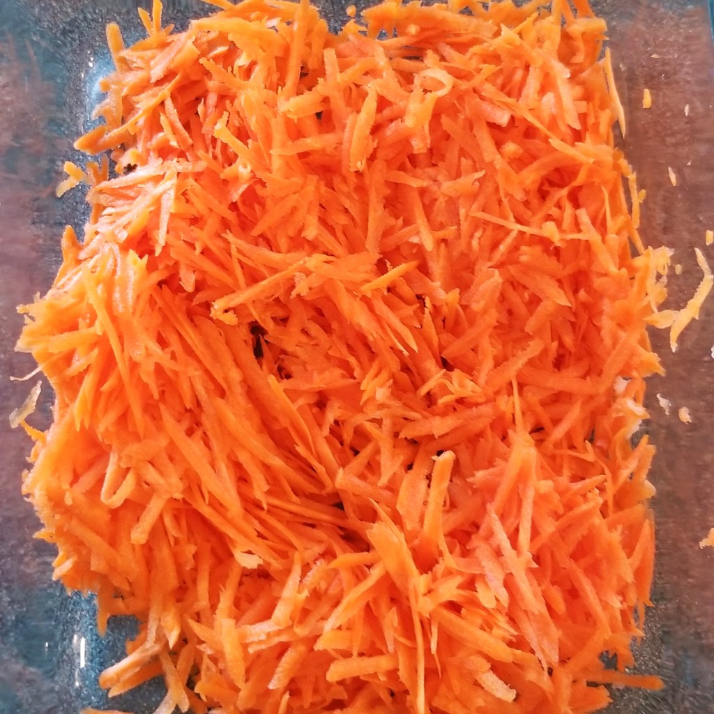 Prepare carrots – Using the same technique, shred one carrot (photo below, left); continue with the second, to obtain about two cups of shredded carrots (photo below, right):