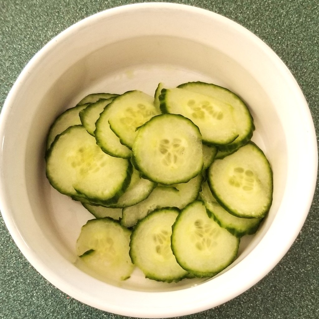 Prepare cucumber – Using the slicing side of the box grater, slide the cucumber over the bottom slot (photo below, left).  Continuing with this motion, thin cucumber slices will be ready to use (photo below, right):