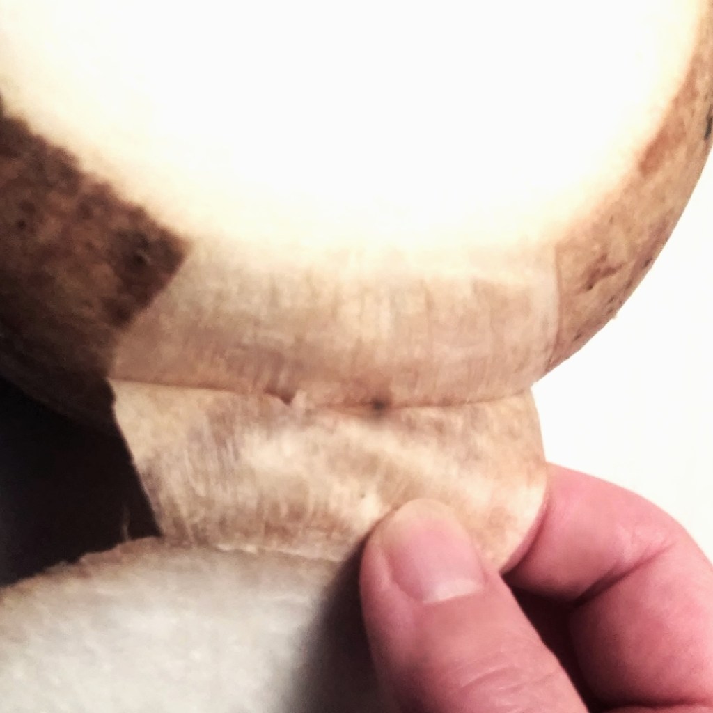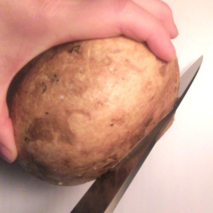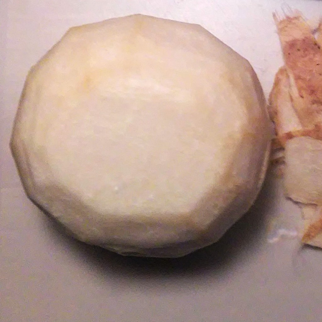 Prepare jícama Carefully slice off ends with a large sharp knife (photo below, left). Peel the skin by pulling from the ends (photo below, centre). Finish removing all the skin with a paring knife, until the white flesh is exposed all around (photo below, right):