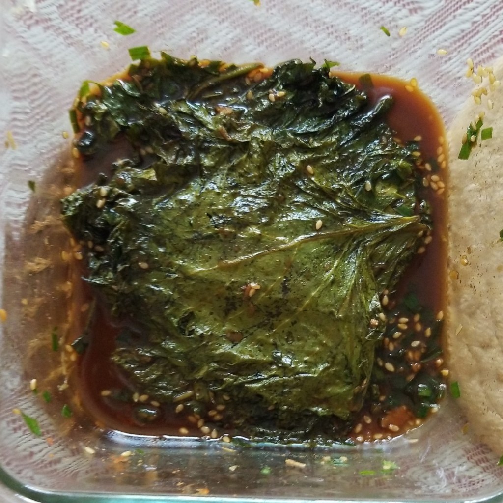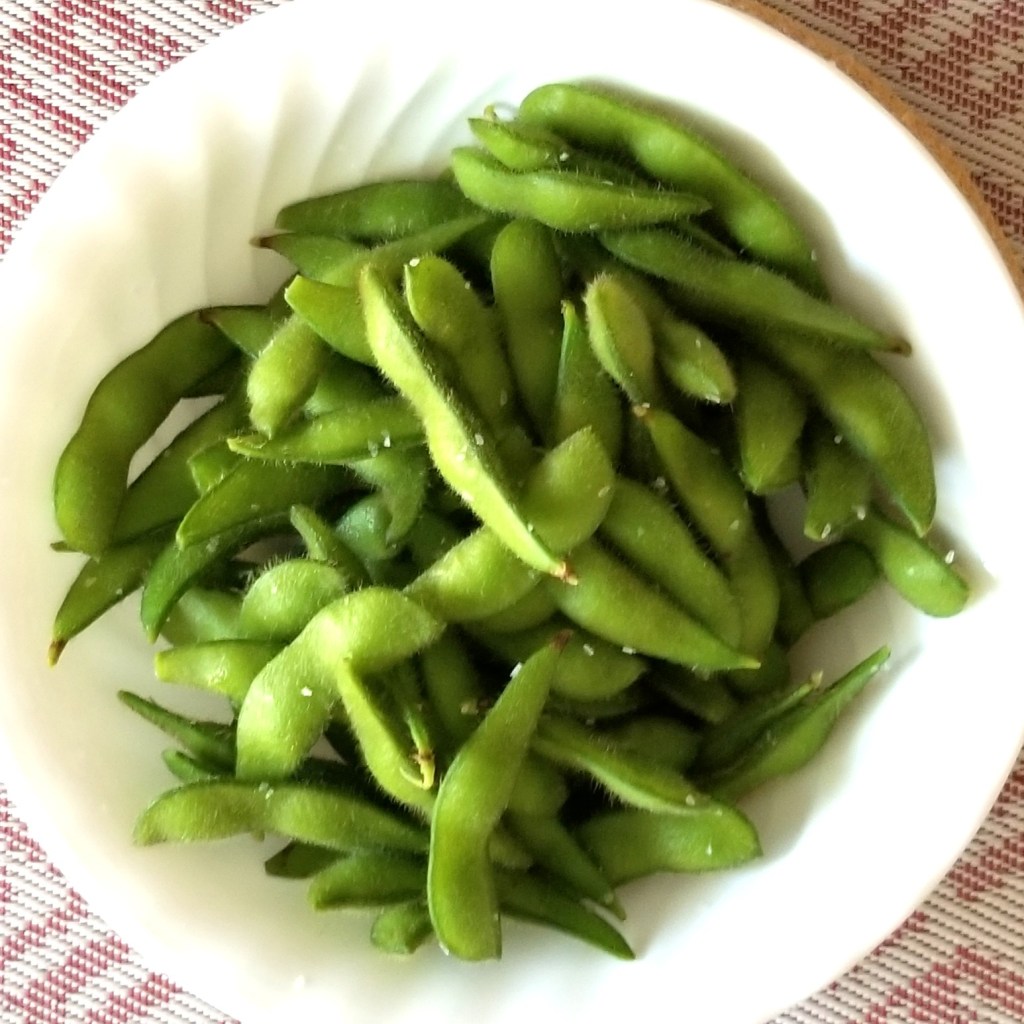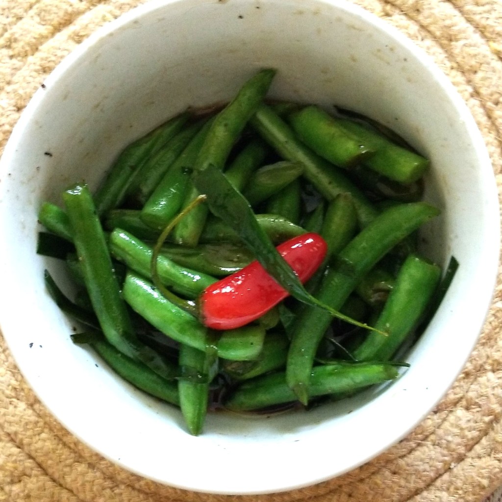 In my previous post, the rest of the harvest consisted of green perilla leaves (ao shiso), edamame pods, garlic chives and green beans. Because of the ingredients, I prepared three Asian-inspired side dishes, from left: steamed perilla with Korean seasoning (chopped scallions, sesame seed, soy sauce, sesame oil and brown sugar); stir-fried green beans with garlic chives and hot peppers, seasoned with soy sauce, rice wine vinegar and black pepper; and boiled edamame with coarse salt: