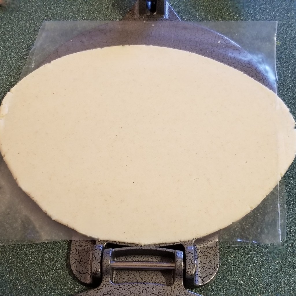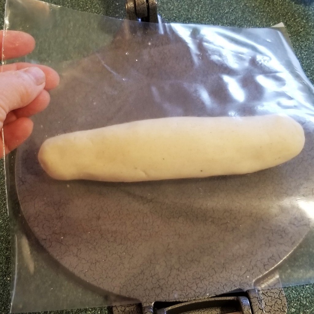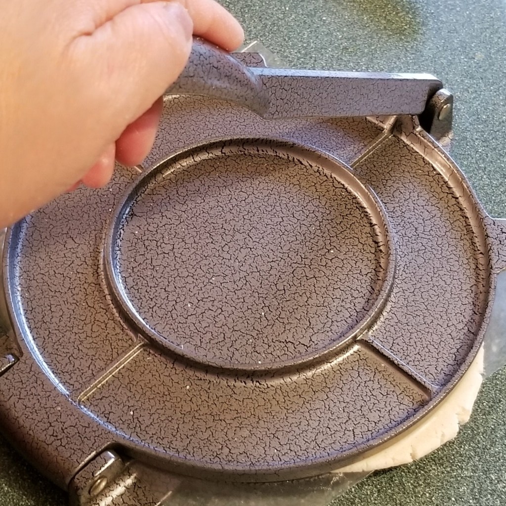 Working with one ball at a time, roll to form a tapered cylinder, about 4 inches (10 cm) long, placing on a piece of plastic on a flat surface or tortilla press (photo below, left). Cover with another piece of plastic and flatten by pressing down with a cutting board or the top of the tortilla press (photo below, centre), to form a thick elongated shape (photo below, right):