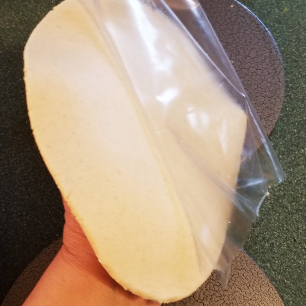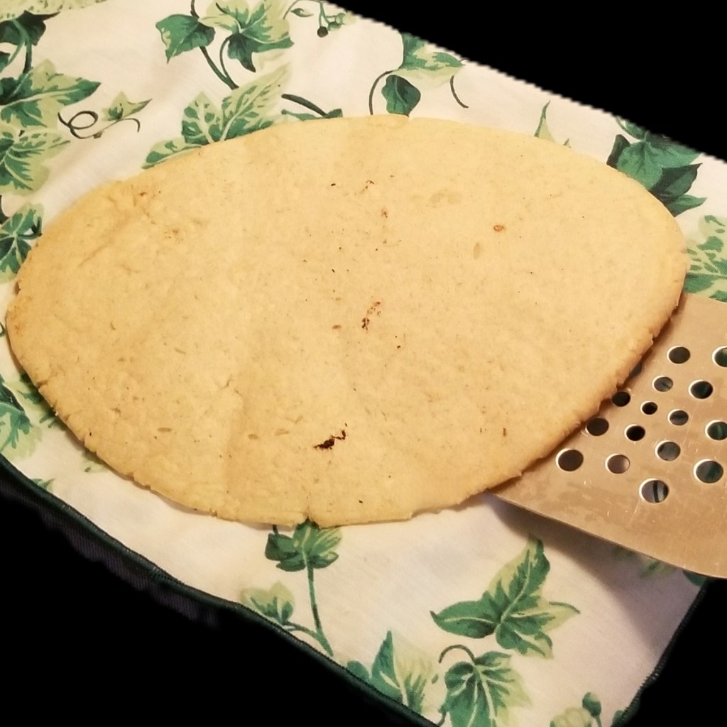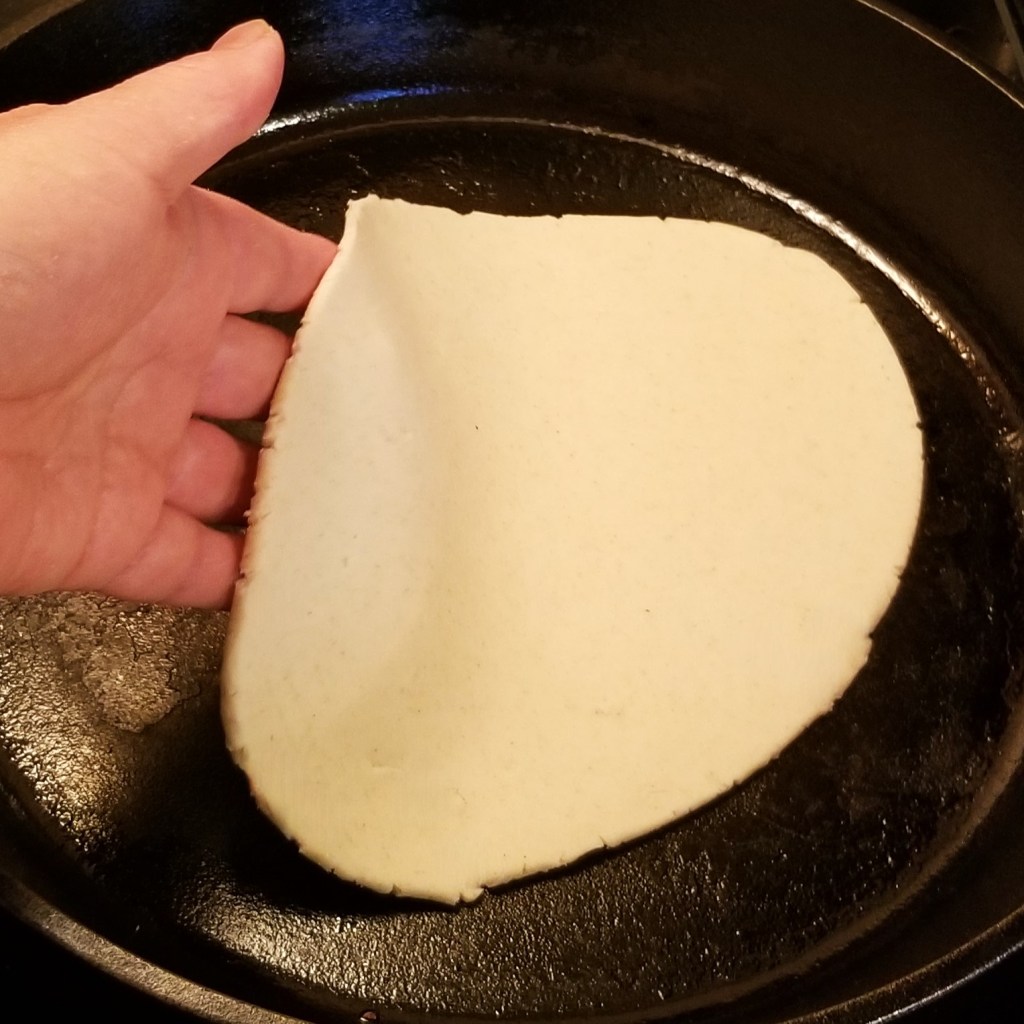 Peel top plastic, then flip oval onto one hand, then peel the bottom plastic with the other hand (photo below, left). Gently slide the dough onto the hot comal or skillet (photo below, right):