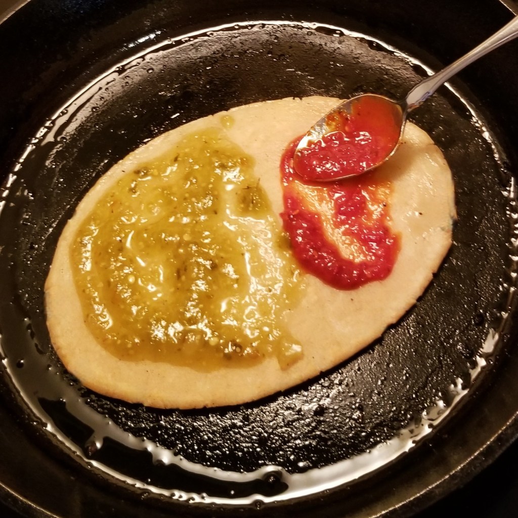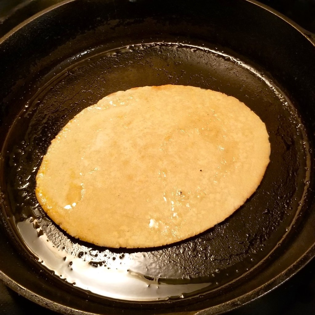 To assemble: add a dollop of lard or one teaspoon of oil to the hot comal or skillet (photo below, left); add one piece of the cooked dough, flipping to crisp both sides (photo below, right):