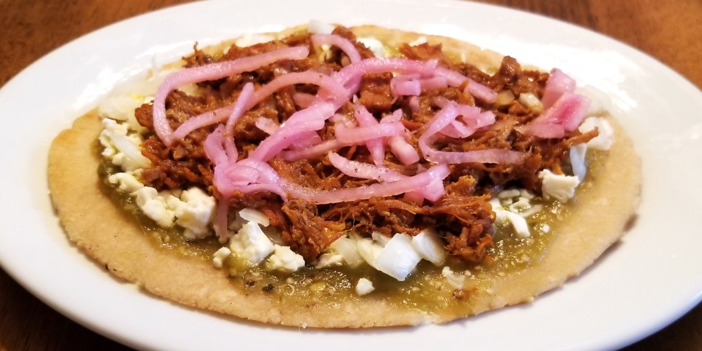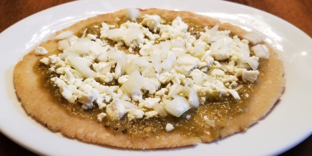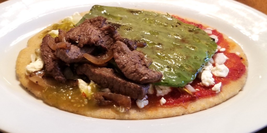 The celebration traditionally continues with music, light displays, fireworks, and of course, what would seem like a bottomless pit of street food. Antojitos (Little cravings) are prepared fresh by street vendors: quesadillas, elotes, tamales, and many other tasty choices, such as pambazos and memelas. It is believed that memelas were already being prepared in pre-Columbian times in Mexico, and parts of Central America; the basic description is of corn dough shaped as a flat and thick oval or circle, grilled and topped with sauce. In more modern versions, the grilled shape is crisped with lard, and cheese and chopped onions are sprinkled on top; other ingredients like meat or veggies may be added. In Mexico City and the state of Puebla, memelas are often prepared with green sauce on one side, and red on the other. As seen in the photo at the top of this post, the addition of white onions and cheese turns these memelas into the perfect bite to celebrate Independence Day with Mexico’s flag colours.