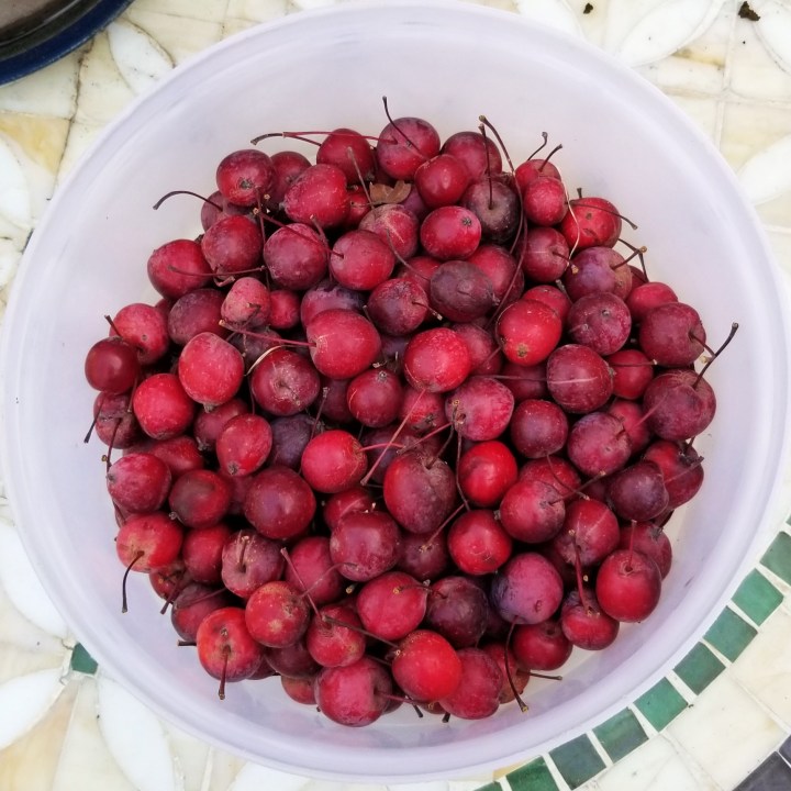 In my previous post, I harvested a bowl full of crabapples from my garden. Because the fruit was so small, it would have been hard to peel or core, and since I use no pesticides in my garden, a lot of it had mould or insect damage: