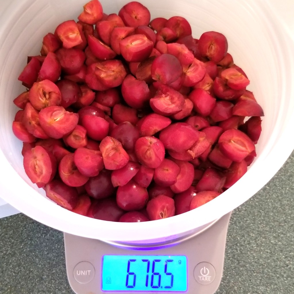 After washing the fruit, to be able to pick all the damaged pieces, it was necessary to individually inspect them, remove their stem, and slice in half to check all the crannies. In the photo below, good fruit along the top row, and damaged fruit on the bottom row: