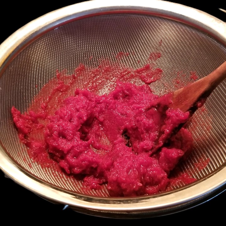 Strain the mashed and cooked fruit through a mesh into a bowl, to remove crabapple seeds, cores, and skin, pressing down with the back of a spoon (if using regular apples, this step is optional, for a smoother jelly):