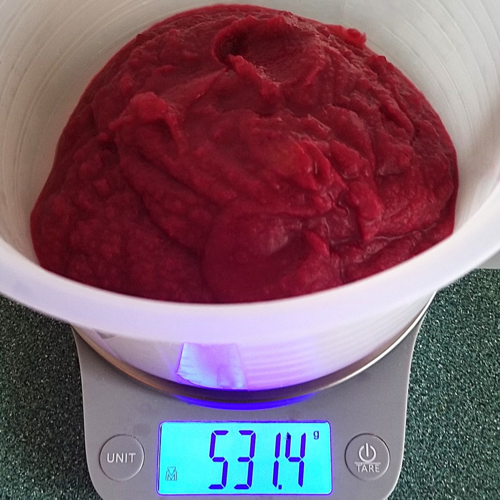 Weigh the strained pulp (if using regular apples, skip this step); for this batch the strained pulp weighed 1.2 lb (531.4 g):