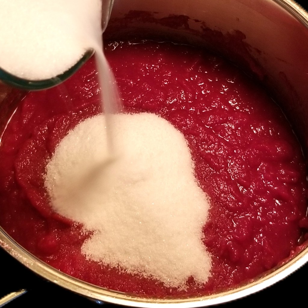Return the pulp to the pot, and place on the stove over medium heat. Add lime juice (if using), and a little under the same amount of granulated sugar, in weight (if using regular apples, add three cups). For this batch of crabapples, I did not use lime juice, and I added two and a half cups of sugar (photo below, left), which are the equivalent of 1.1 lb (500g). Continue cooking, stirring constantly, to dissolve the sugar (photo below, right):