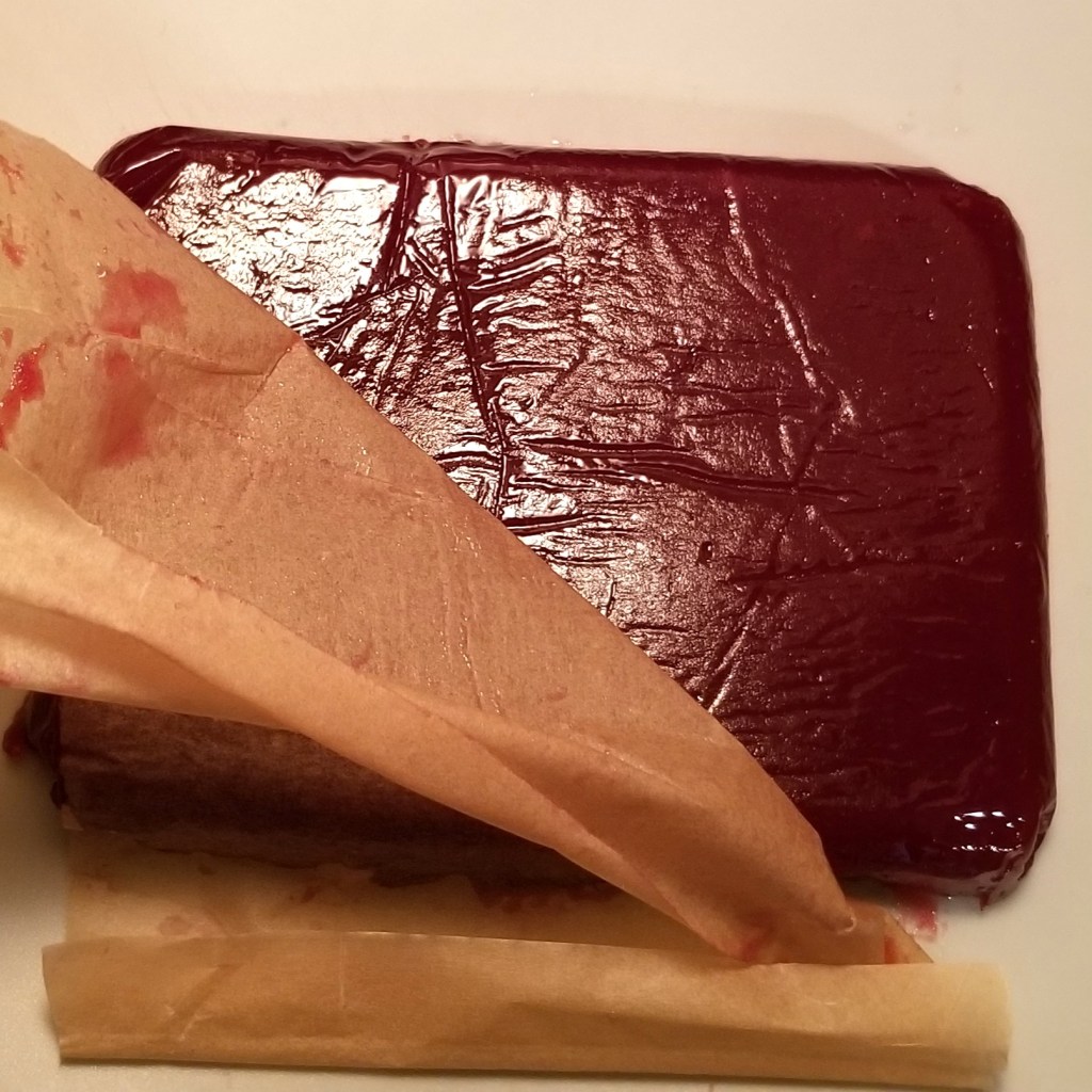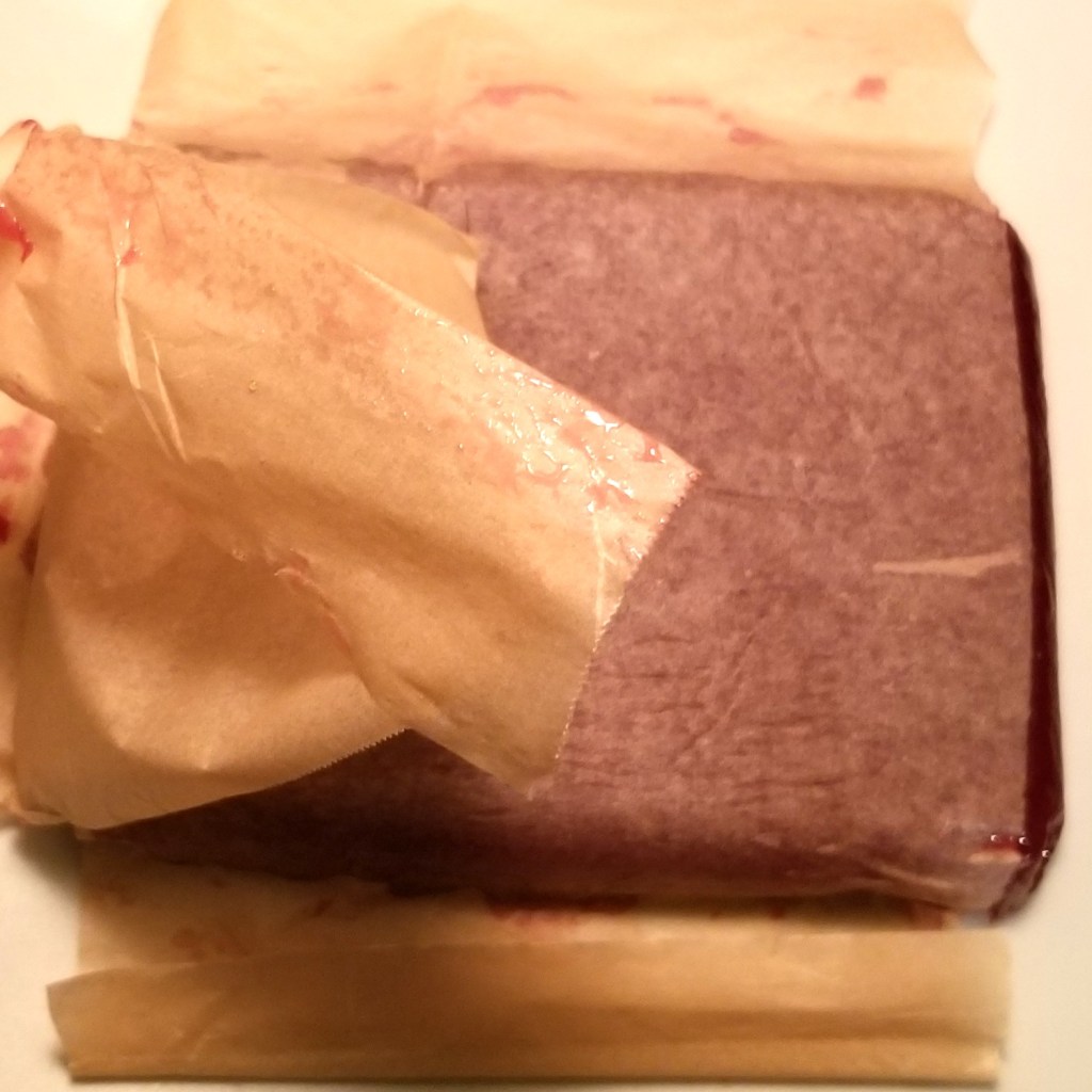 Cover and store in the fridge overnight. The next day, the jelly has set (photo below, left). Remove from the mould by holding and lifting the paper strips (photo below, right):