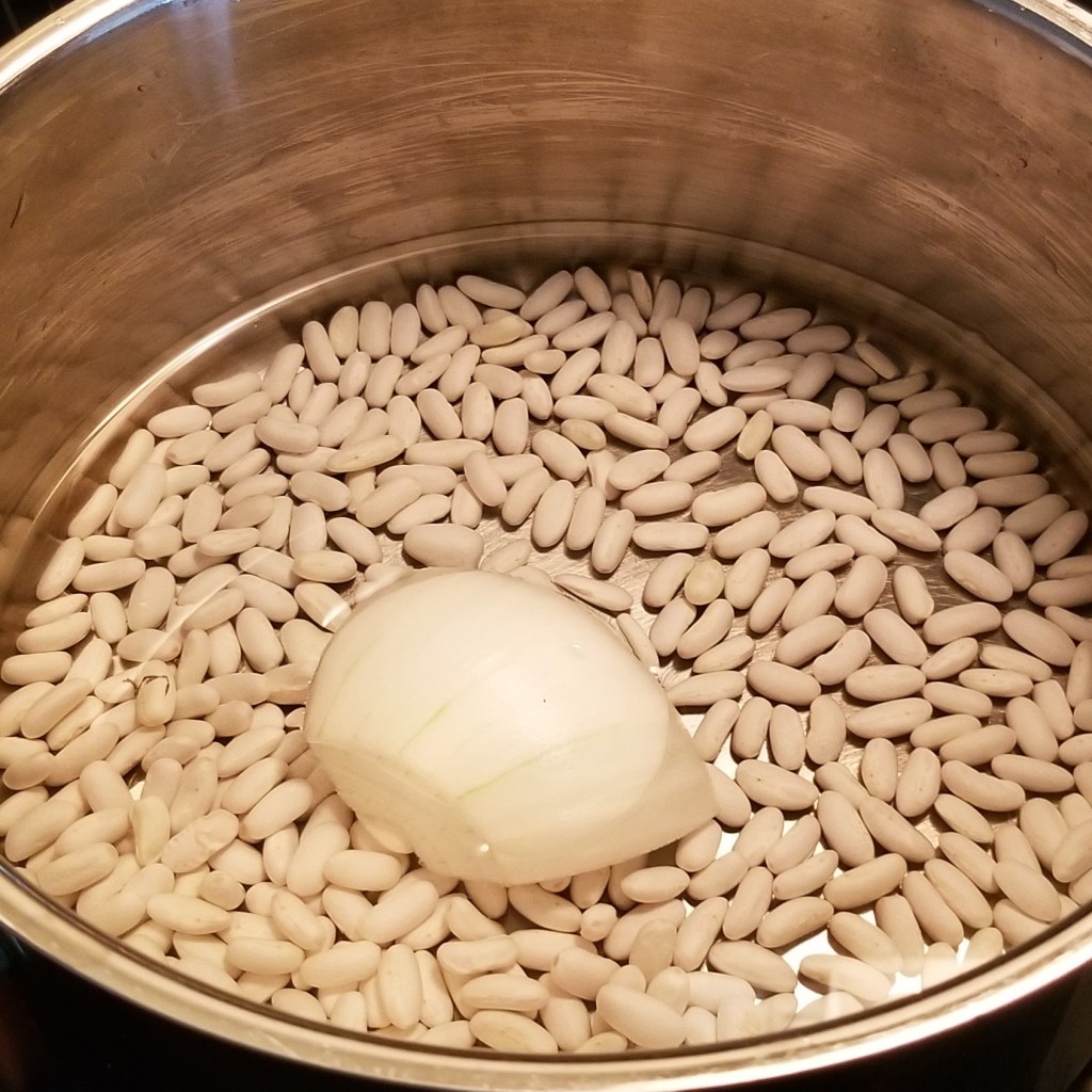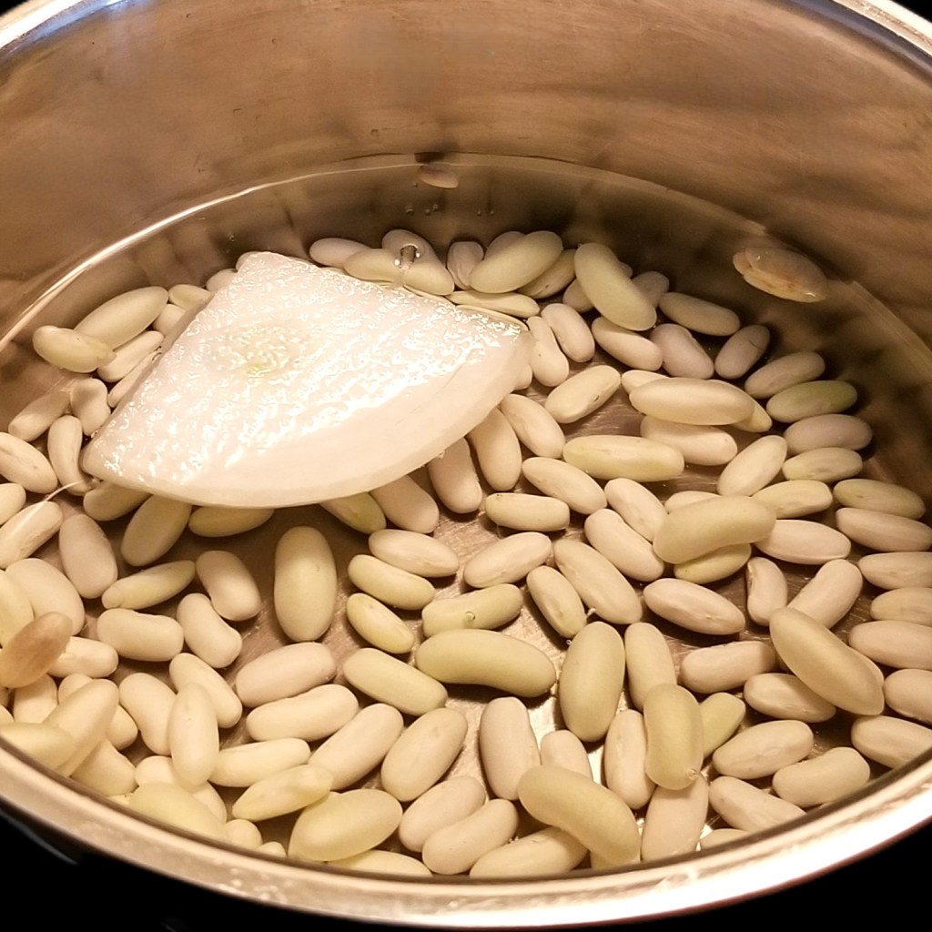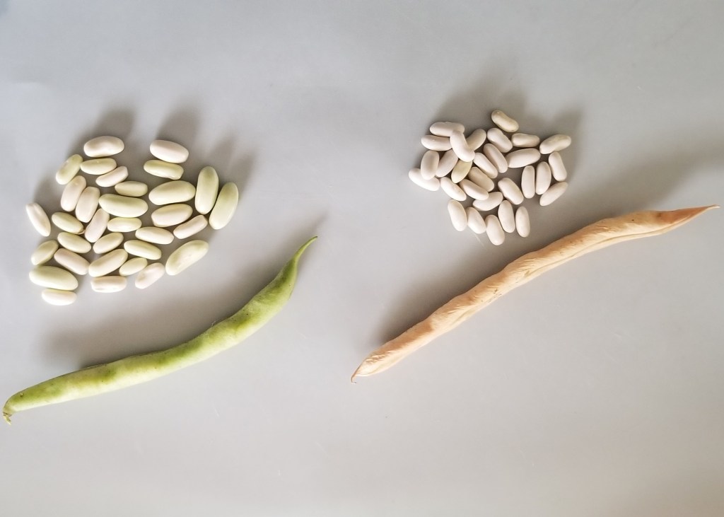 Just to check how each kind would cook, I put about three quarters of a cup of each in separate pots, with water and a piece of onion; beans from green pods in the photo below, left, and from dry brown pods, right: