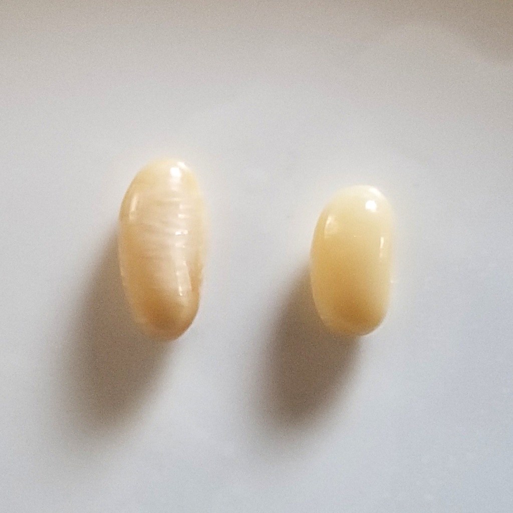 The fresh beans from the green pods swelled even more, and started to crack after cooking for about 35 minutes (photo below, left), while the beans from the dry brown pods got rehydrated and grew, but remained smaller than the other batch, and did not crack; these took 45 minutes to cook( photo below, right):