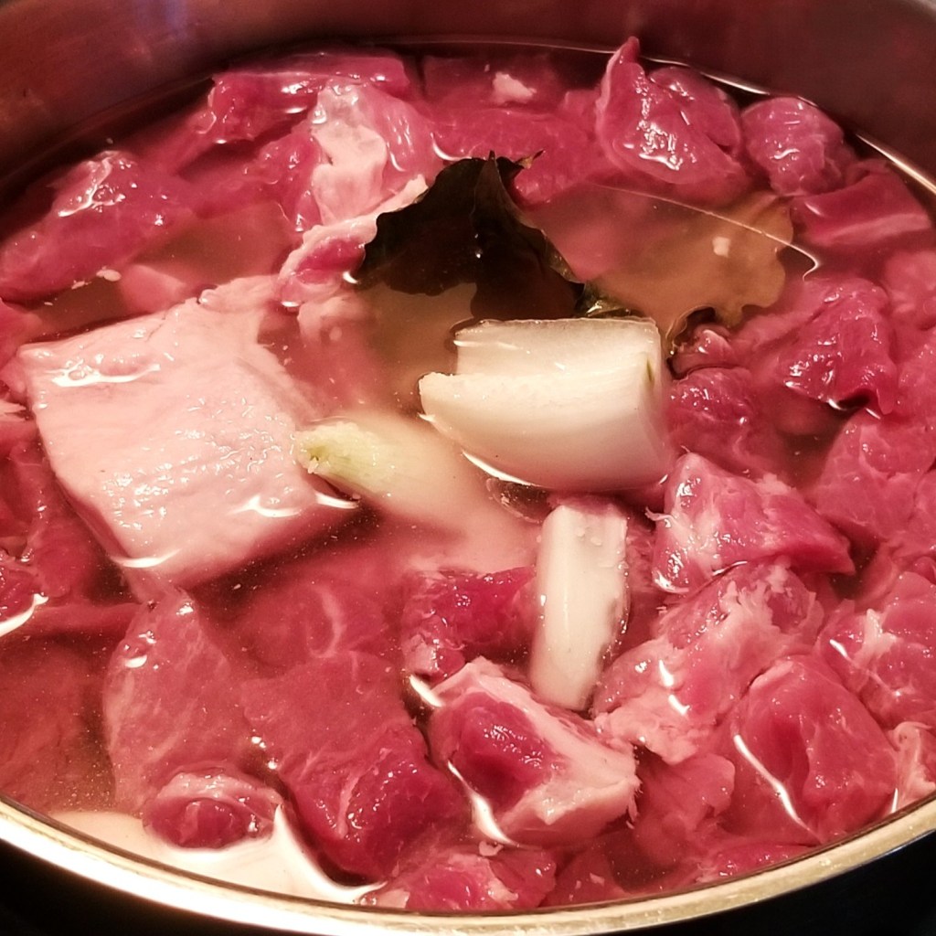 Place meat, one quarter of the onion, bay leaves, and one teaspoon of salt in a large pot; add water to cover, and place pot on the stove at high heat: