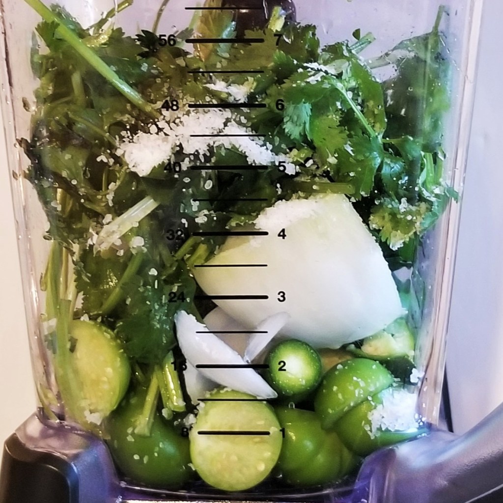 Meanwhile, place tomatillos, one quarter of the onion, hot peppers, one teaspoon of salt, and half the cilantro in blender jar: