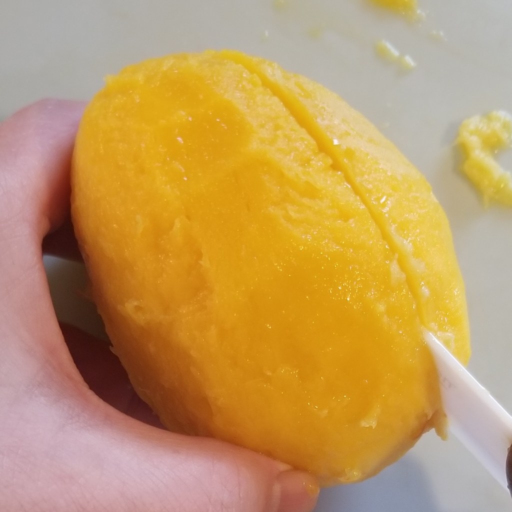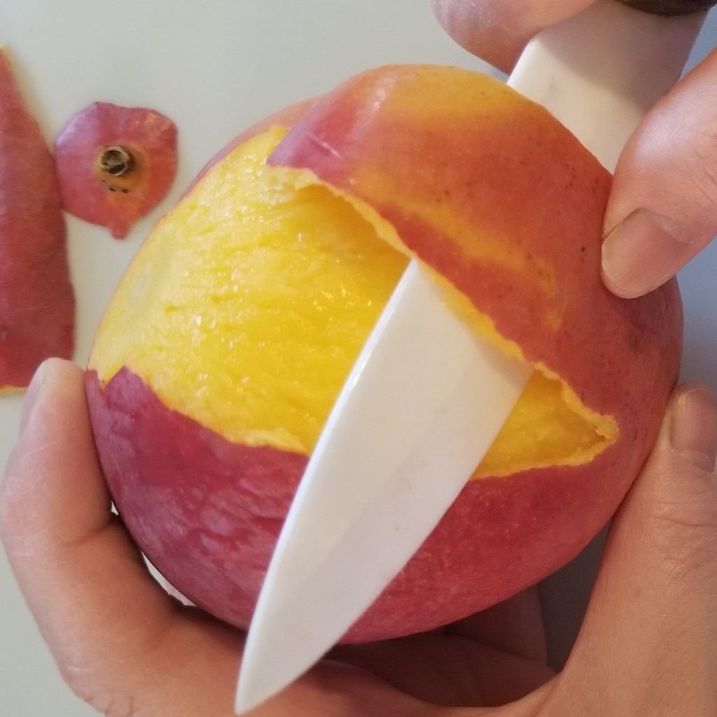 To process, wash and dry the mangoes. Remove stem end, and use a knife to pull strips of skin away from pulp; the skin should easily peel (photo below, left). Cut slices of pulp as close to the pit as possible (photo below, right):