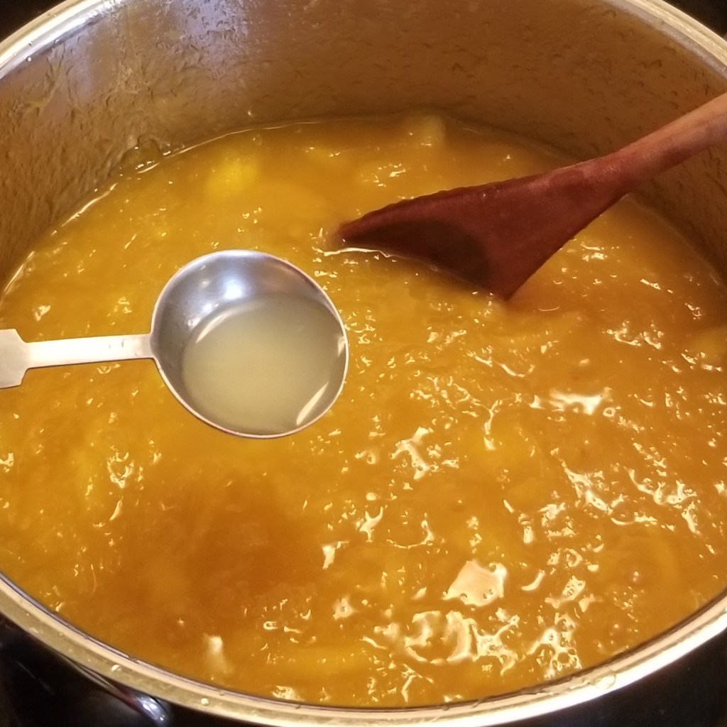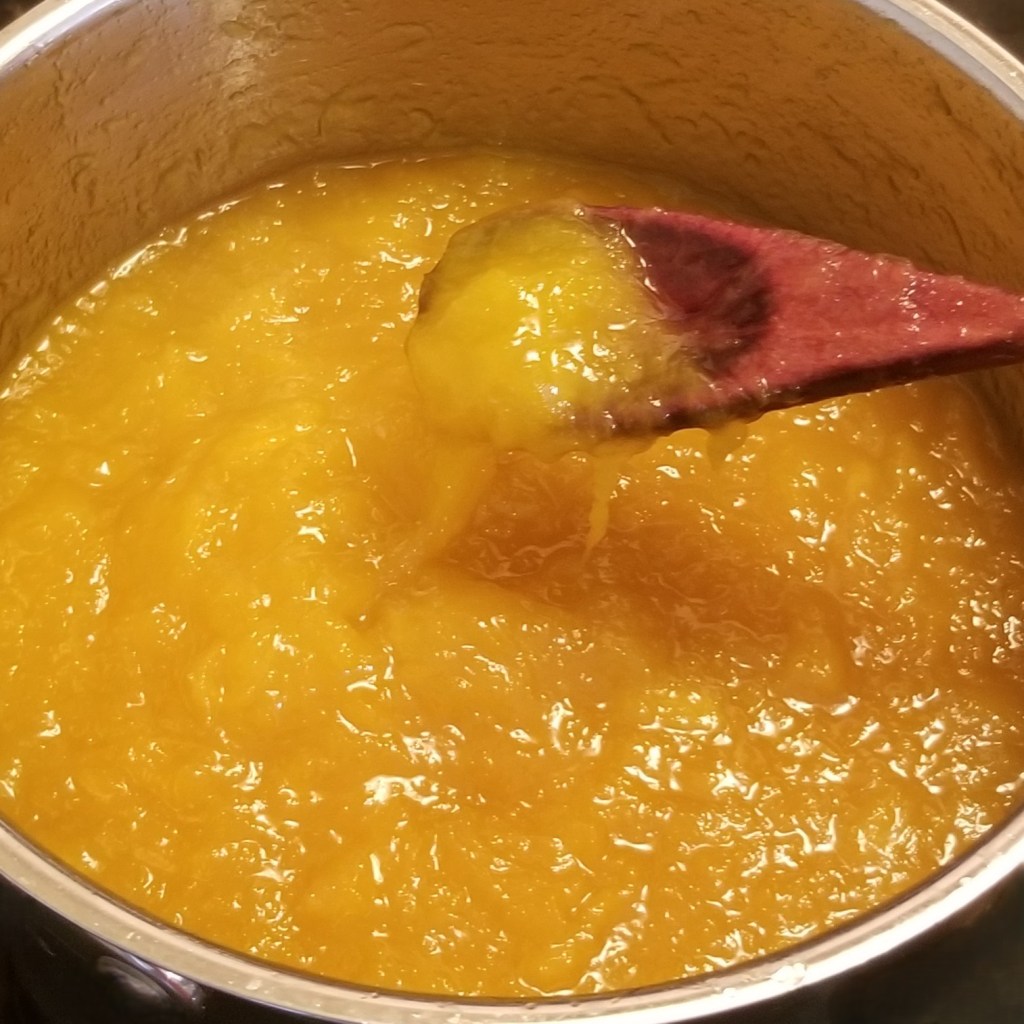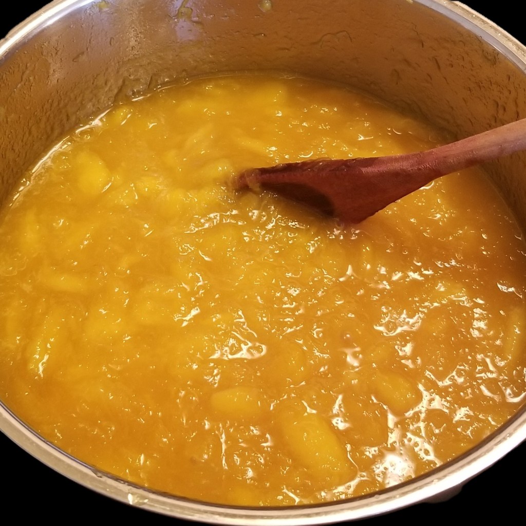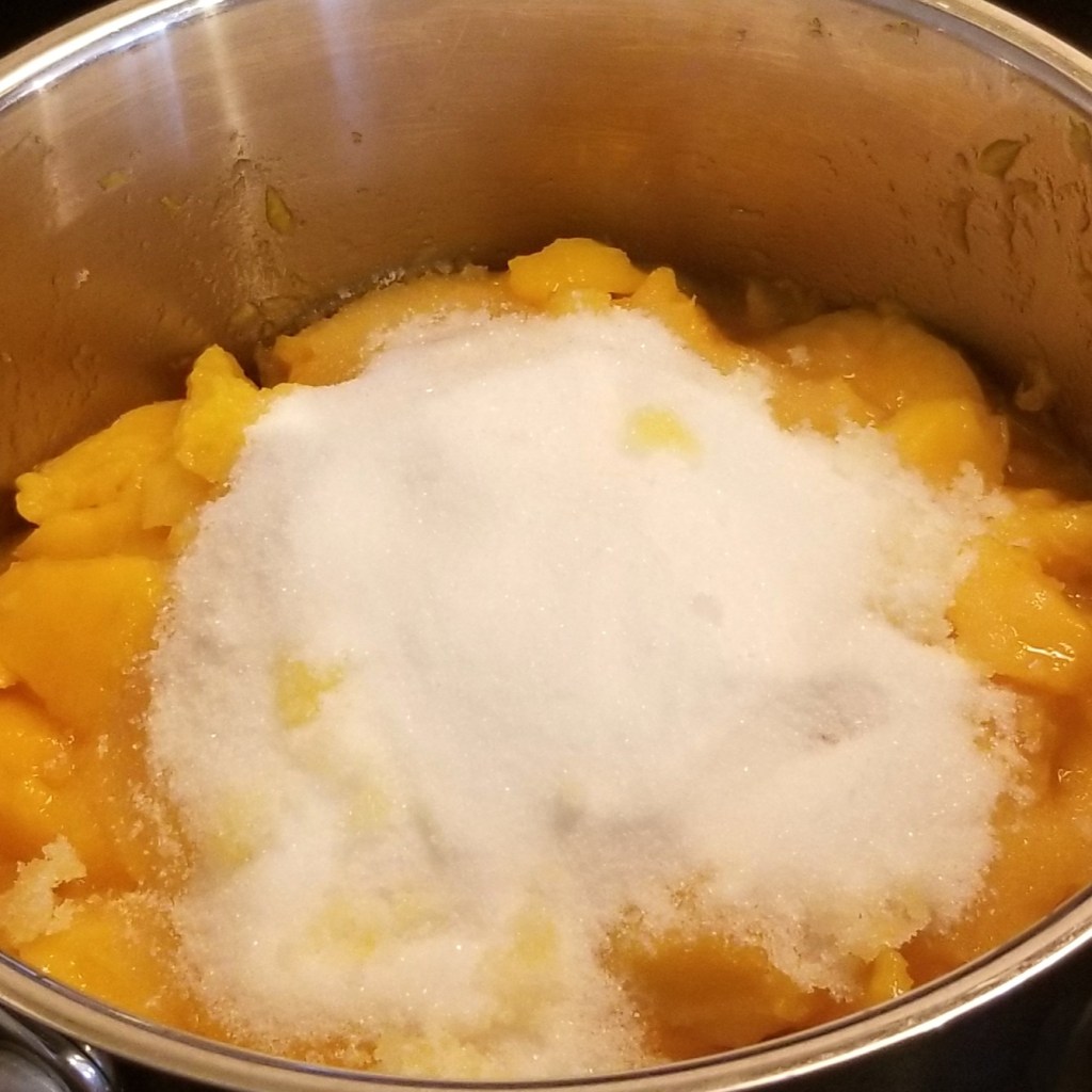 Place mango chunks (approximately five cups), water and sugar in a pot over high heat (photo below, left). Cook for approximately twenty minutes, stirring occasionally, until the fruit is soft and the mixture looks shiny (photo below, right):