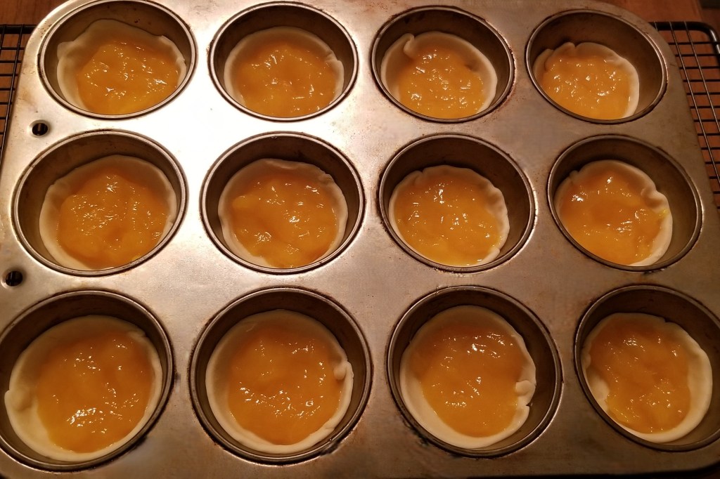 Roll dough to about 1/8 inch (3 mm) thick. Cut circles using the rim of a glass or a round cookie cutter, roughly the same size as the diameter of a muffin mould. Press one dough circle down each muffin mould, to line the inside, then fill with a generous tablespoon of mango spread; repeat with all the dough and spread: