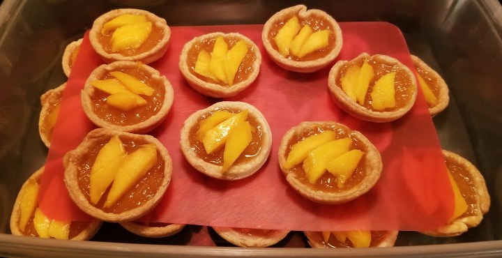Bake in preheated oven to 350ºF (180ºC) for 25-35 minutes, until crusts are golden brown. Remove trays from oven and let cool for at least 20 minutes before removing tarts from moulds. Once cooled, top with a few slices of fresh mango: